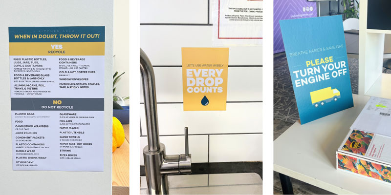 Staff and guests are reminded to recycle correctly and conserve water and energy with helpful signage.