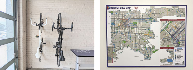 Convenient indoor bike storage and a map of the safe bike routes in Denver making riding to work easy and stress-free.